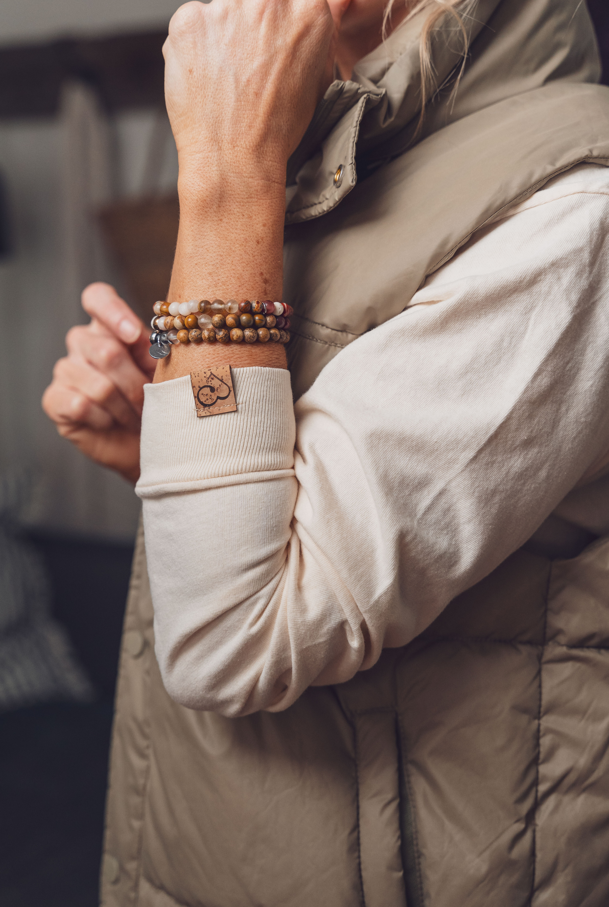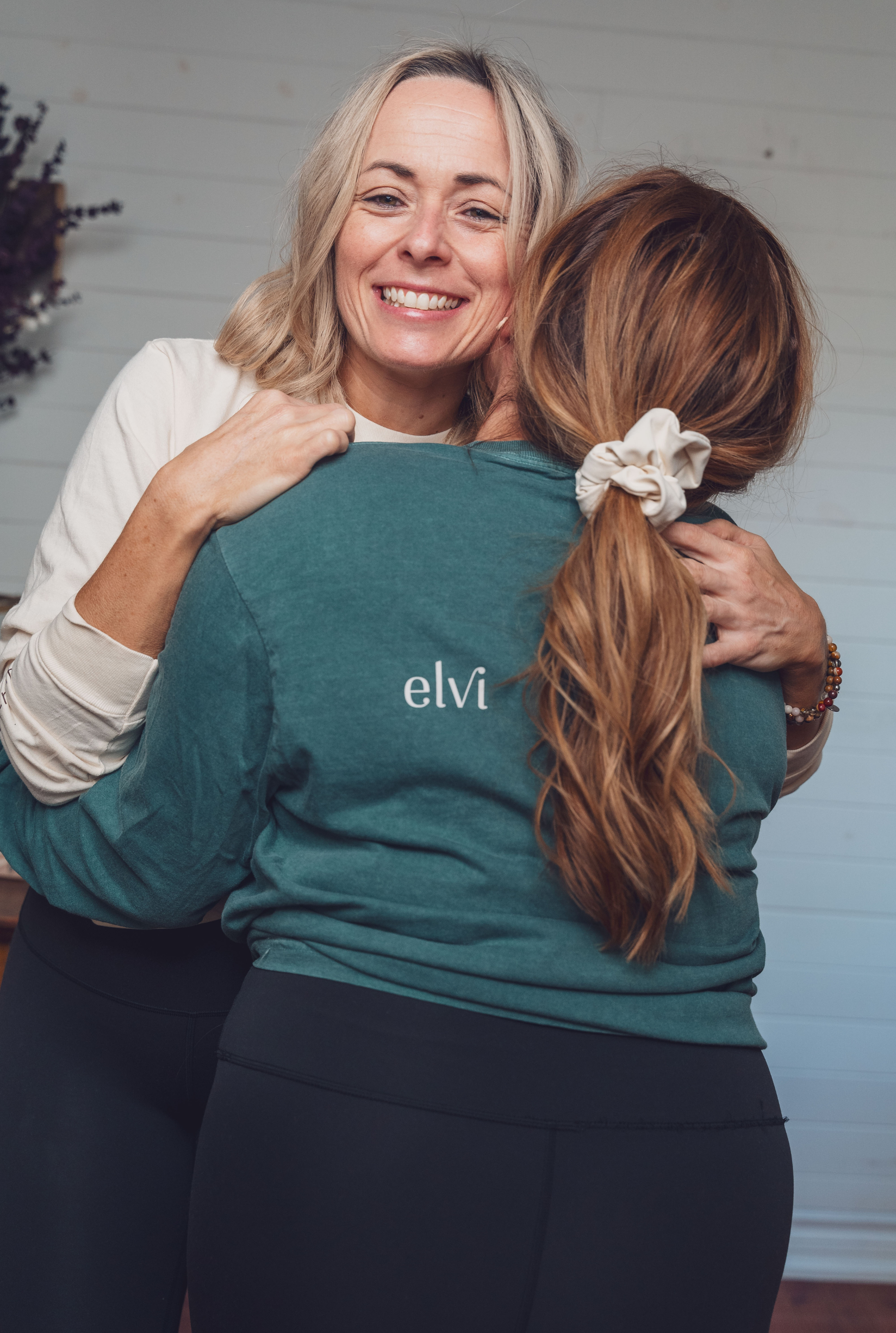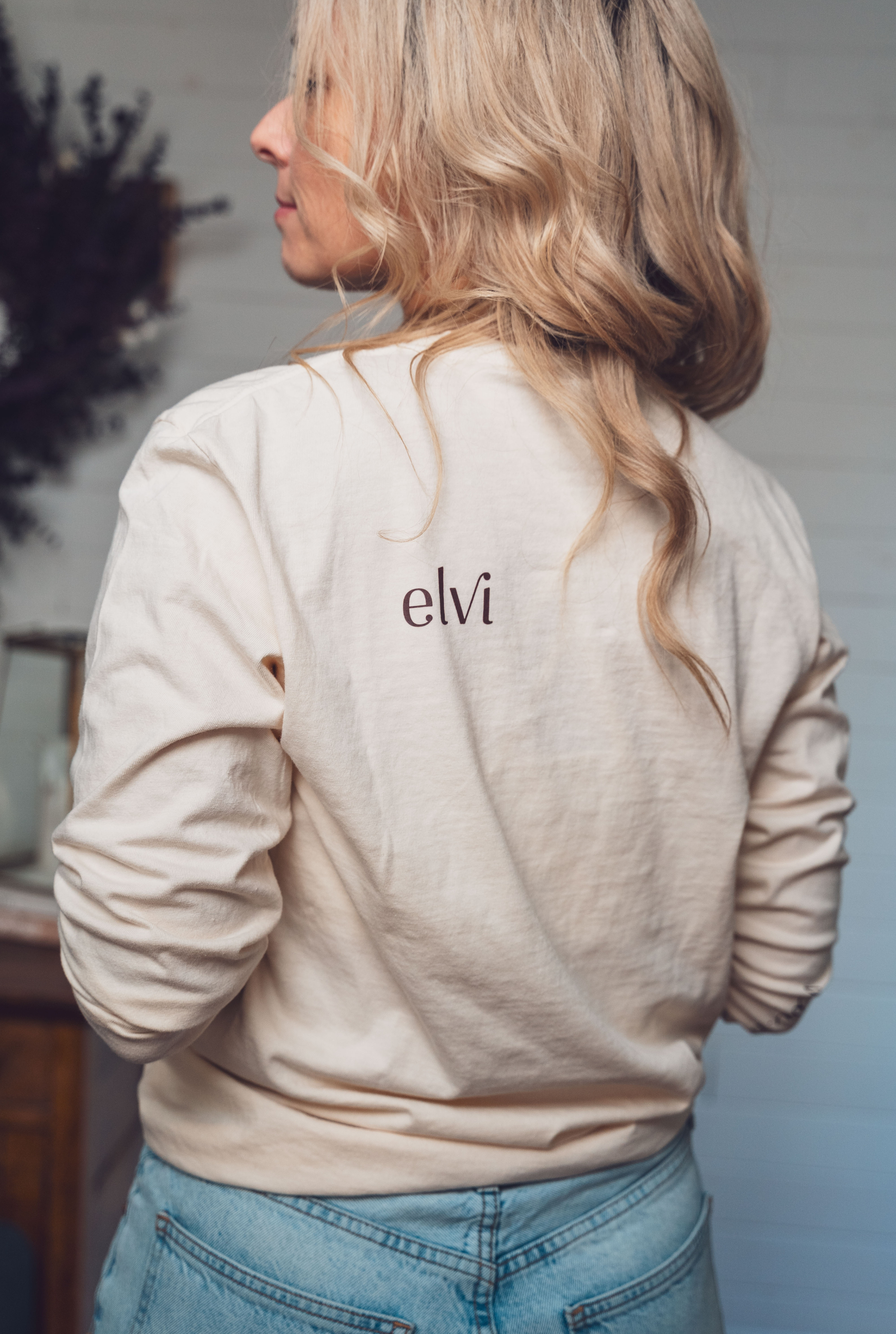 Son design épuré met en valeur les détails qui font toute la différence — l’icône elvi au cœur, symbole d’ancrage et d’expression de soi, le logo discret sur l’omoplate, et le mantra “moi. maintenant.” sur l’avant-bras, comme un doux rappel à vivre pleinement l’instant.