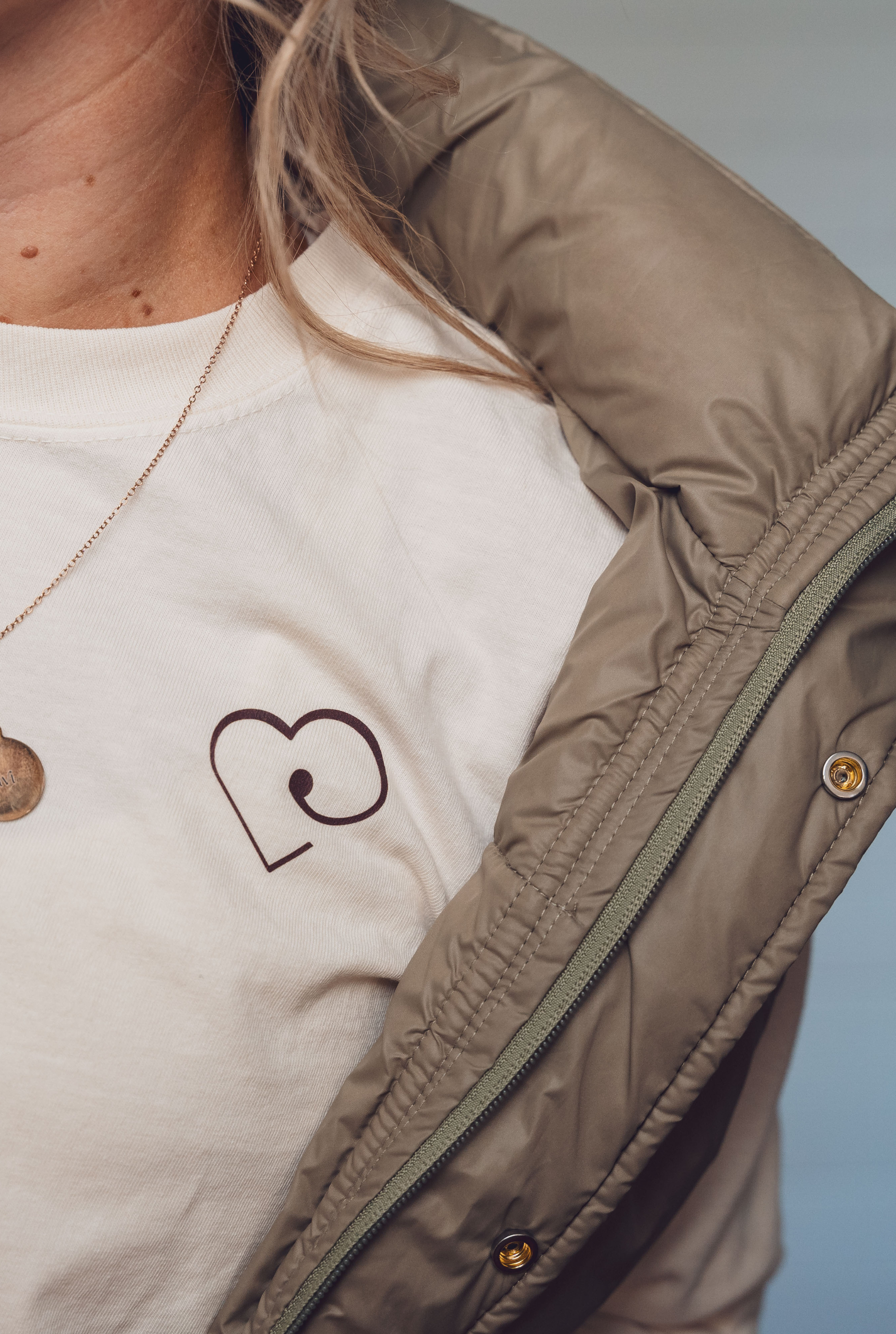 Détails imprimés : icône elvi (cœur), logo discret (omoplate), mantra (avant-bras)