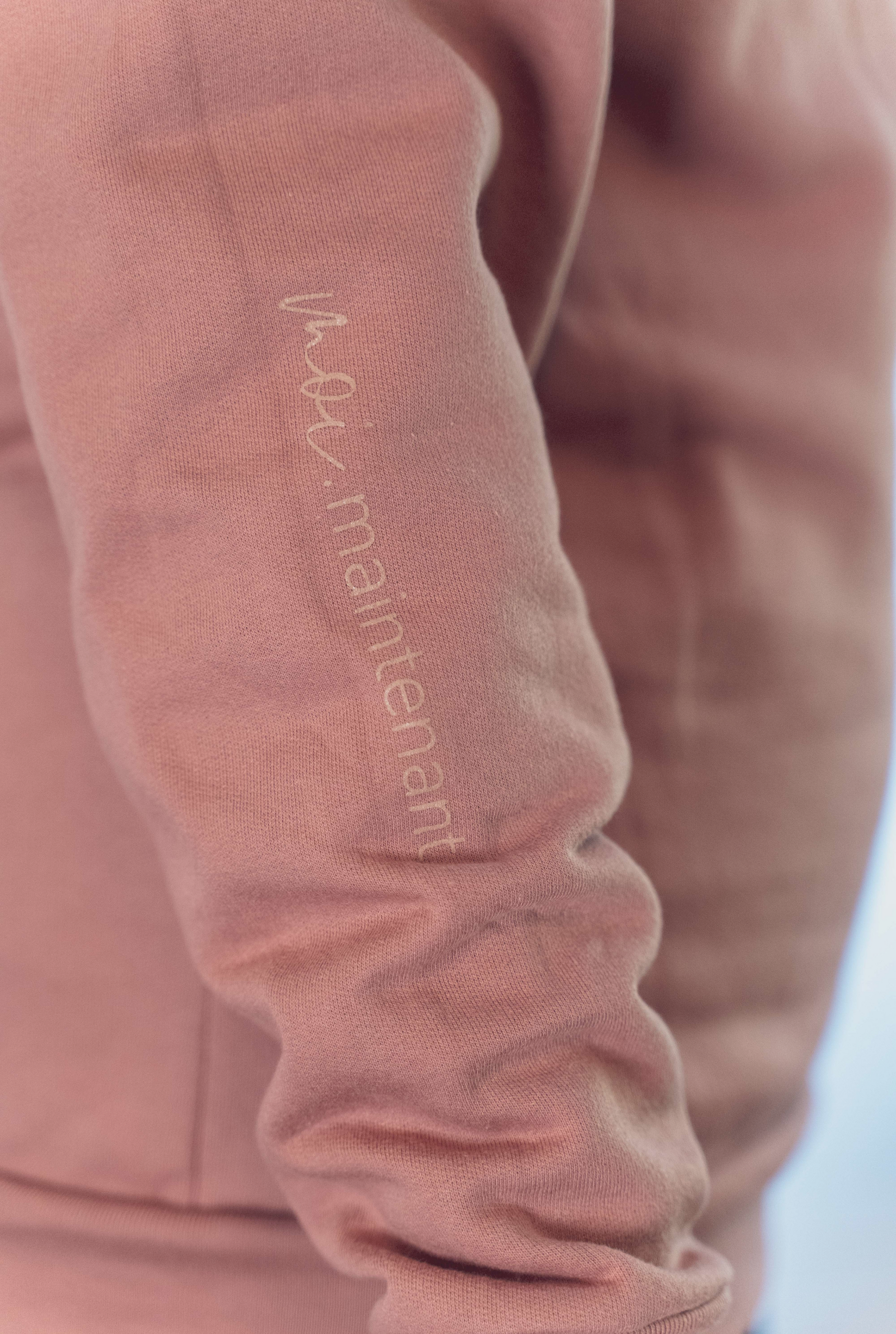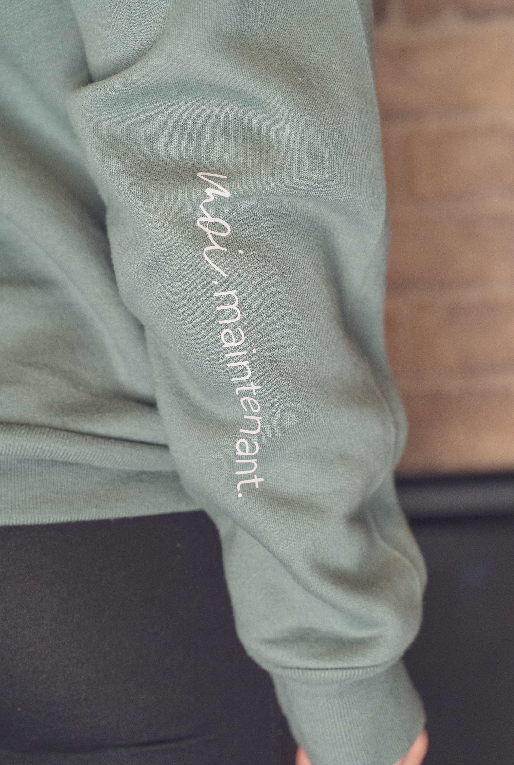 Confectionné au Québec de façon écoresponsable, il est fait d'un doux jersey de coton (50%) et de polyester (50%), envers ouatiné tout confort. Les bordures aux poignets et à l'encolure sont côtelées.